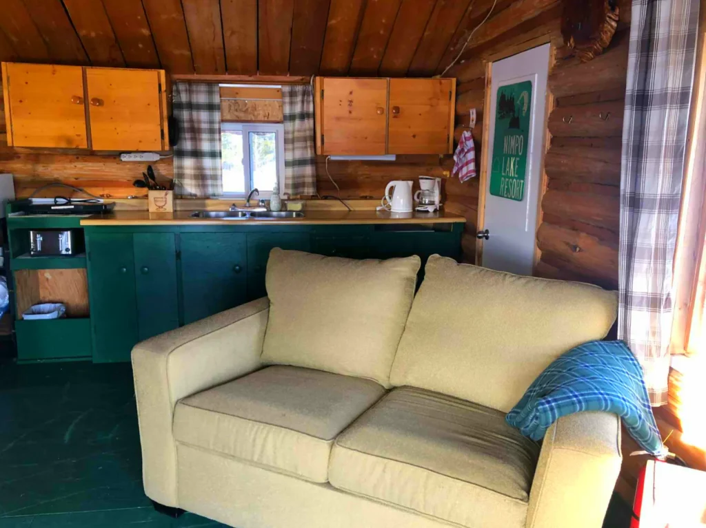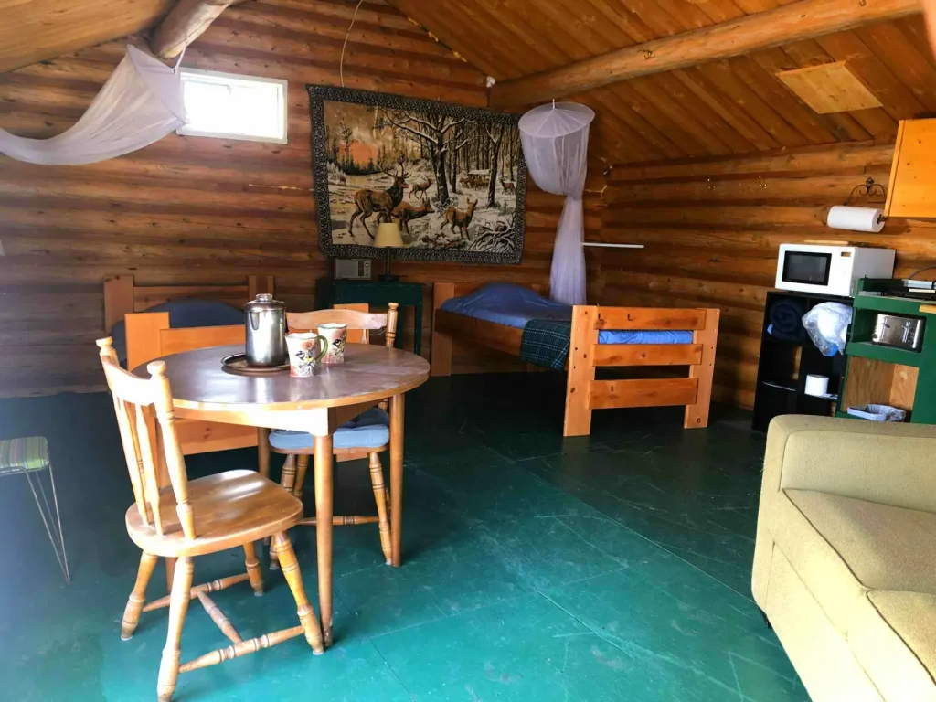 Glamping Cabin is a rustic seasonal cabin perched on higher ground within the resort, offering nice views of the lake. Although the cabin has cold running water and a basic kitchenette, hot water for washing must be heated manually due to electrical limitations. An outdoor toilet and shared shower are provided nearby.